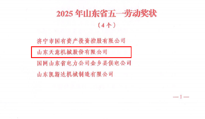 喜報(bào)丨熱烈慶祝天意機(jī)械榮獲“山東省五一勞動獎狀”