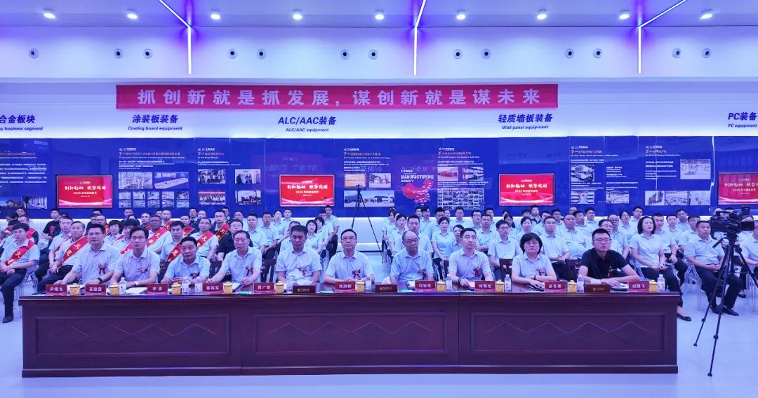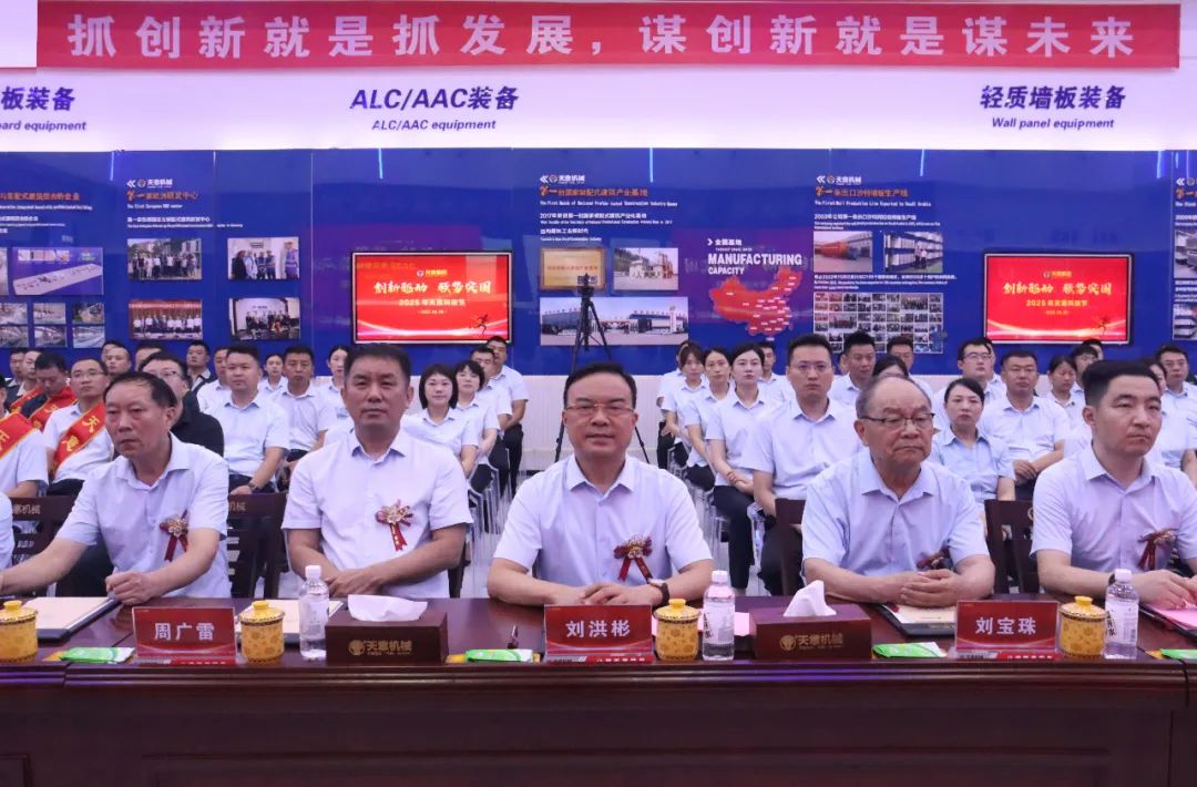 最后,集團(tuán)董事長劉洪彬做集團(tuán)總結(jié)及未來展望。劉總指出,天意上半年發(fā)展呈現(xiàn)三方面特點(diǎn),第一,創(chuàng)新驅(qū)動(dòng):以創(chuàng)新為市場回暖積蓄力量。上半年,研發(fā)了模塊智能化柔性生產(chǎn)線,為模塊化房屋建造提供智能裝備,研發(fā)了光伏清掃機(jī)器人,提供光伏電站清潔解決方案。天意榮獲山東省五一勞動(dòng)獎(jiǎng)狀,入選山東省先進(jìn)級智能工廠、省級專家服務(wù)基地,卓越也建成了新的工業(yè)互聯(lián)網(wǎng)展廳。上半年,產(chǎn)學(xué)研合作邁出新步伐,天意與山東大學(xué)共同舉辦了“天意杯”山東大學(xué)第五屆智造未來創(chuàng)新大賽,山東交通學(xué)院黨委書記王偉一行、山東建筑大學(xué)校黨委常委、副校長邱立平一行來集團(tuán)參觀座談,共謀發(fā)展新篇章。第二,國際市場:用中國智造點(diǎn)亮"一帶一路"。上半年,天意參加了俄羅斯國際工程機(jī)械展、廣交會(huì)、德國寶馬展、漢諾威工業(yè)博覽會(huì)、沙特阿拉伯利雅得五大行業(yè)展覽會(huì)等重量級國際展會(huì)。塔吉克斯坦總統(tǒng)親臨考察的墻板項(xiàng)目,成為當(dāng)?shù)鼐G色建筑的示范工程。與俄羅斯客戶簽訂了ALC和PC大單。這些突破不僅帶來了42%的出口增長,更讓中國建材高端裝備贏得了世界尊重。第三,強(qiáng)勢突圍:三大引擎驅(qū)動(dòng)未來發(fā)展。在鞏固裝配式建筑裝備主業(yè)的同時(shí),培育了三大新增長極,分別是光伏清掃機(jī)器人(已具備智能導(dǎo)航、自主清潔、高效節(jié)能等特點(diǎn))、智慧物流(目前已有京東、拼多多、好想來等大型企業(yè)入駐)、新能源業(yè)務(wù)板塊(天意已實(shí)現(xiàn)了80%的綠電生產(chǎn),正在搭建離網(wǎng)儲(chǔ)能系統(tǒng),未來還將建設(shè)微電網(wǎng)和虛擬電廠)。