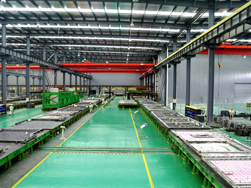 PC環(huán)形疊合板生產(chǎn)線(xiàn)采用高精度、高結(jié)構(gòu)強(qiáng)度的成型模具,經(jīng)自動(dòng)布料機(jī)把混凝土澆筑其中、振動(dòng)臺(tái)振搗后并不立即脫模,而是經(jīng)預(yù)養(yǎng)護(hù)、蒸汽養(yǎng)護(hù),使構(gòu)件強(qiáng)度滿(mǎn)足設(shè)計(jì)強(qiáng)度時(shí)才進(jìn)行拆模處理,拆模后的成品構(gòu)件運(yùn)輸至成品暫存區(qū)或室外堆場(chǎng),而空模臺(tái)沿輸送線(xiàn)自動(dòng)返回,形成自動(dòng)化環(huán)形流水作業(yè)。