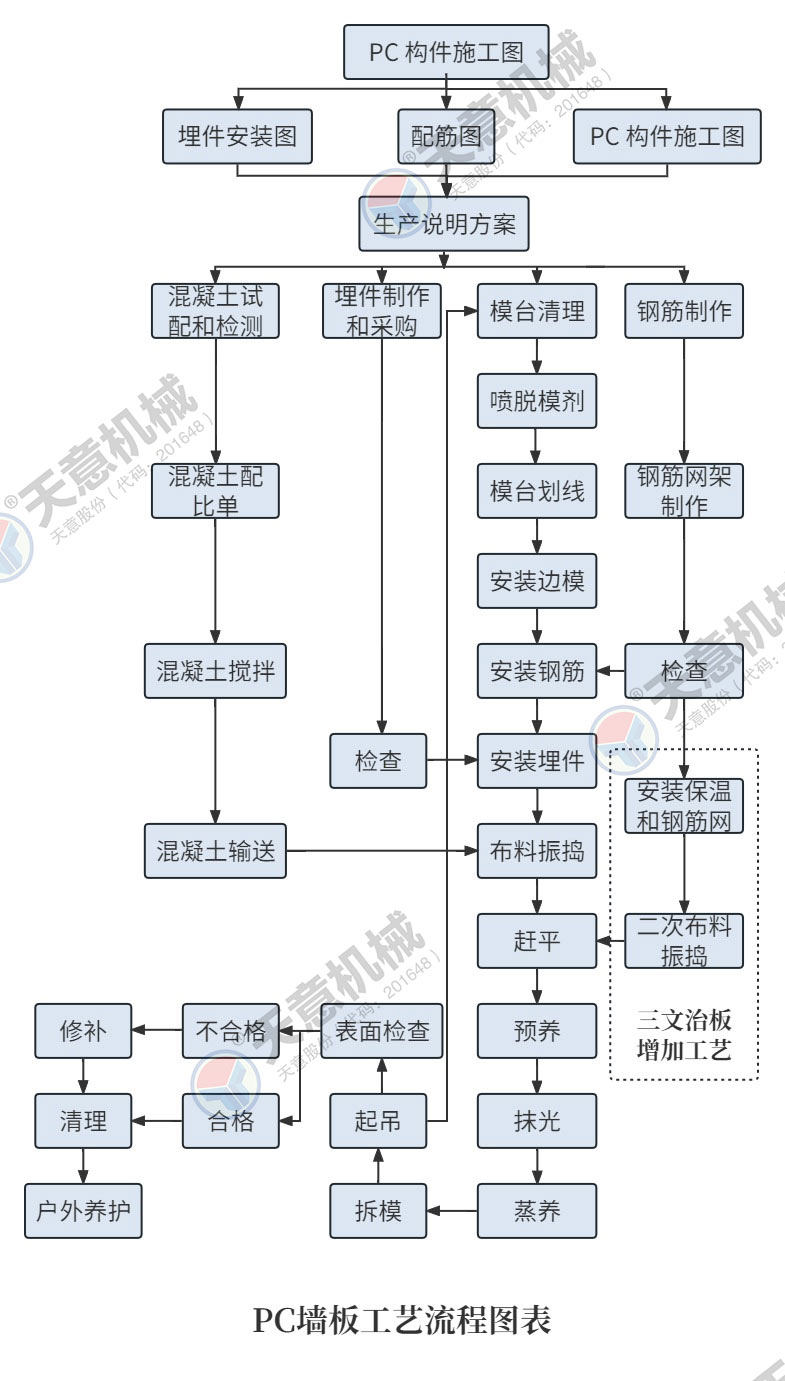 PC環(huán)形疊合板/內(nèi)墻板生產(chǎn)線的主要設備包括雙梁橋式起重機、清理機、脫模劑噴涂機、布料機、振動臺、趕平機、拉毛裝置、預養(yǎng)窯、抹光機、碼垛車、養(yǎng)護窯、翻轉機、擺渡車、支撐滾輪、驅動輪、模臺和成品運輸車等。