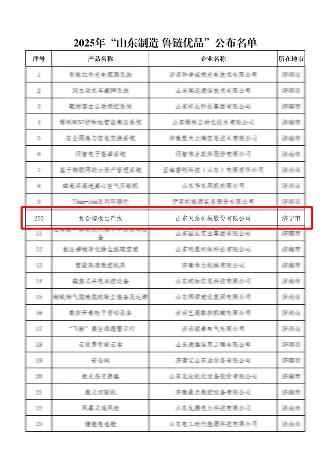 喜報|天意機(jī)械復(fù)合墻板生產(chǎn)線榮獲“山東制造·魯鏈優(yōu)品”