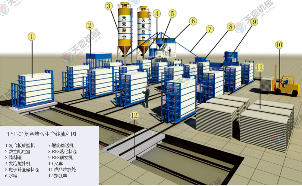 設備特點 TYF-01型立式復合墻板生產(chǎn)線,設備占地面積小,產(chǎn)品一次成型,產(chǎn)量高。主機配有自動行走系統(tǒng),設備運轉更簡單快捷,大型固定式攪拌設備,攪拌料漿更均勻,澆注效率更高。 工藝流程