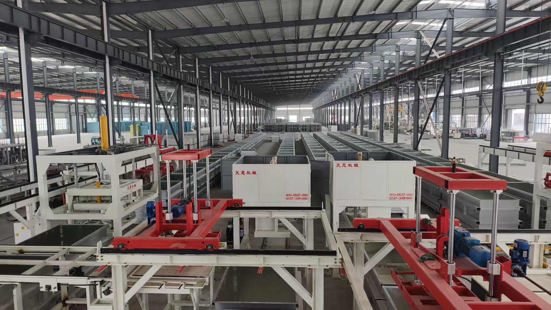 勻質(zhì)生產(chǎn)線主要生產(chǎn)工序包括:原料儲存、原材料自動輸送和計(jì)量系統(tǒng)、攪拌系統(tǒng)、澆注系統(tǒng)、壓膜成型系統(tǒng)、養(yǎng)護(hù)、出塊系統(tǒng)、自然養(yǎng)護(hù)、切割系統(tǒng)、成品碼垛系統(tǒng)等。